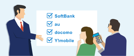一般的に、他社様では決められたキャリア1社のみのご案内となっておりますが、当社はソフトバンク・ドコモ・au・ワイモバイルの4社を取り扱っており、お客様に最適なプランのご提供が可能です。法人携帯のプロであり、企業様のビジネスパートナーとして、全キャリアの中から貴社のニーズや状況に合った最適な法人プランをご案内します。