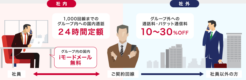 社内への国内通話が24時間定額になるなど、法人のお客さま向けのおトクな割引サービス!