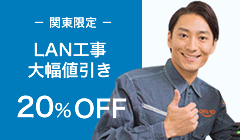 「電話工事・LAN工事・電気工事・内装工事」の中から3つをお申込みいただくことで、工事代金が20%OFF! 迅速な対応、オフィス環境のご提案、安心のアフターフォロー等、お客様のご要望に誠心誠意お応えいたします。