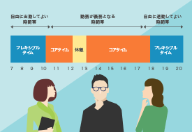 フレキシブルタイム、コアタイムを基軸に勤務時間を自由に設定、管理することができます。