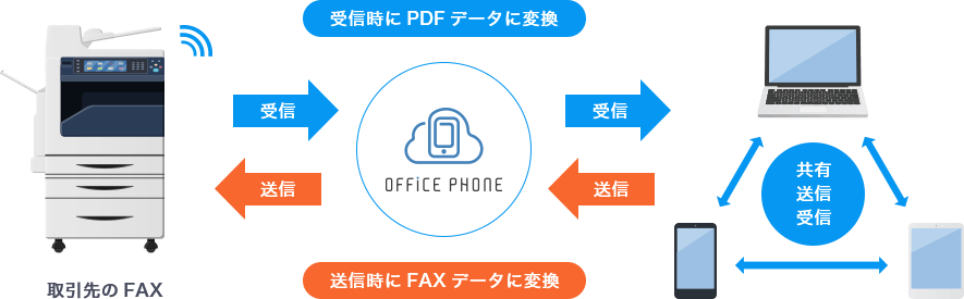 インターネット通信を使ってFAXの送受信をおこなえ、通常のFAXで送信されたファイルをデジタルデータとしてPCやスマホで受信したり、逆にPC・スマホからメール感覚でデータを送信してそれを相手方のFAX機で通常のFAXと同じように受信することができます。