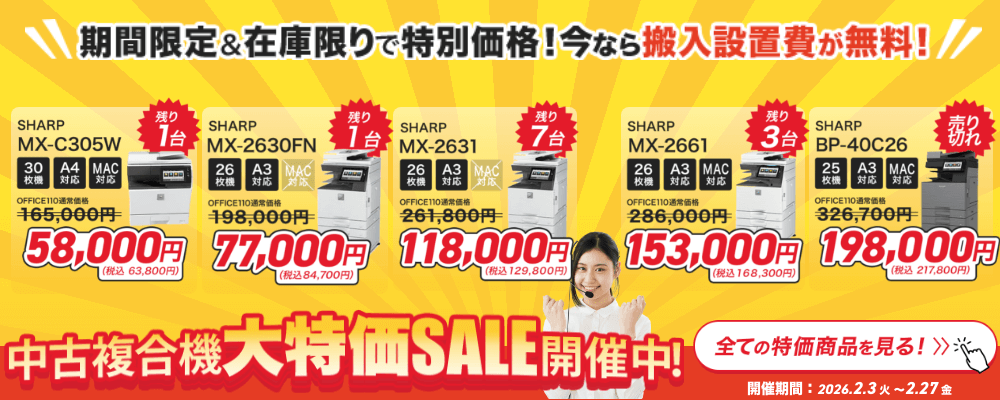 MX-2631 メーカー SHARP(シャープ) 評価 5.0点 ★★★★★ 多彩な機能でスキャンを効率化 便利機能 26枚機 カラー対応 A3対応 MAC対応 通常価格 261,800円 キャンペーン価格 129,800円 マルチクロップスキャンに対応。複数の領収書・写真なども一度にスキャンができ、スキャン業務の効率化を実現します。 在庫・納期を確認する(無料) MX-2631 詳細 中古