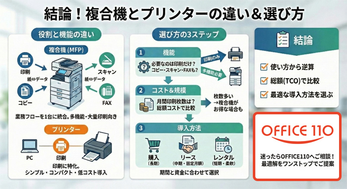 最後に、機種や契約の細かな条件で総額は変わります。最短ルートで最適解にたどり着くなら、OFFICE110にご相談ください。要件整理から見積り比較、設置・設定、運用・保守まで、ワンストップで支援します。