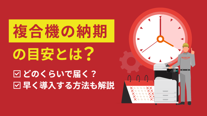 複合機の納期とは?導入の目安・遅れの理由・早く納品する方法 複合機の納期について、こんな疑問はありませんか? 複合機は問い合わせから納品までどのくらいかかる? 急いで複合機を導入したいけれど、早くするにはどうすればいい? 複合機の納品期間は、製品の在庫状況や配送スケジュール、契約...