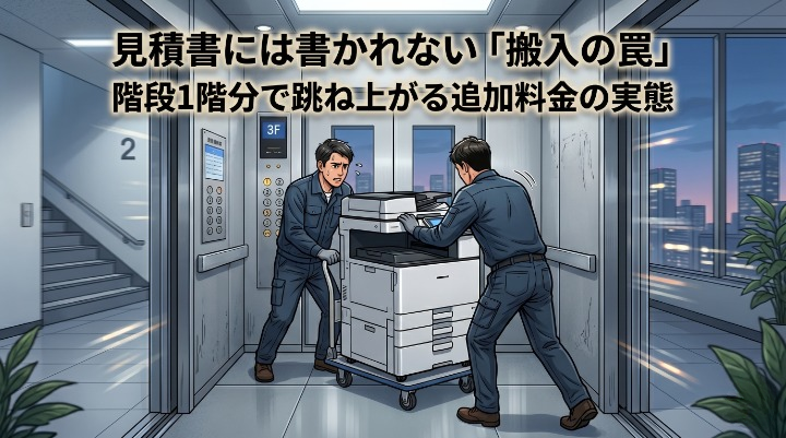 こうした感覚だけで判断すると、導入直前になって「想定していた金額と違った」と感じるリスクが高まります。本記事では、約2年7か月にわたる相談記録をもとに、複合機(コピー機)の搬入費がエレベーターの有無でどう変わり得るのか、実際にどこでつまずきやすいのかを整理します。