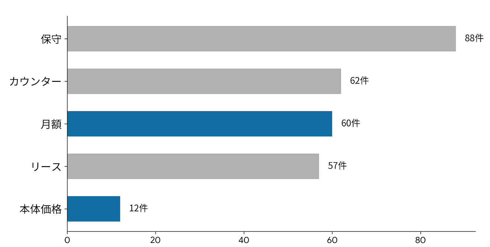 OFFICE110に寄せられた2022年以降の複合機(コピー機)の長期相談データをAIで徹底解析したところ、 「月額」の話が出た相談が60件、 全体の約【56.6】%確認されました。