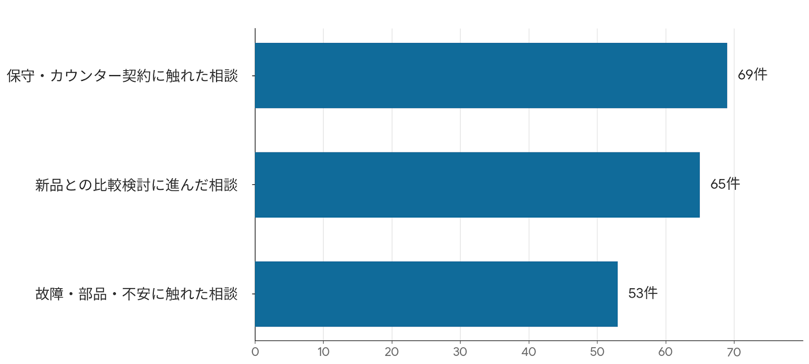 今回の長期相談記録の分析では、「中古検討」に関する相談が71件確認されました。これは、中古への関心が高いだけでなく、少しでもコストを抑えたい一方で、導入後に失敗したくないと考える企業が多いことを示しています。