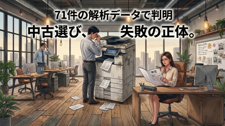 OFFICE110に寄せられた2022年以降の複合機(コピー機)の長期相談記録をAIで詳しく分析したところ、 「中古を検討したい」「中古で十分か知りたい」「故障が多くないか不安」といった相談が71件、 全体の約67%確認されました。