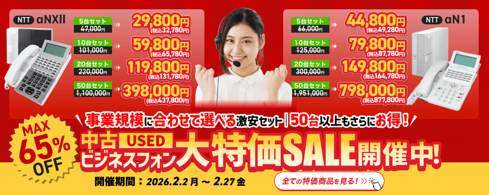 αN1 type S メーカー NTT 評価 4.5点 ★★★★★ 電話機10台・外線4chに対応 中古価格 6,900円(税込)/1台 キャンペーン価格 お問い合わせください。 小規模のオフィス・事業所に対応。省エネ設計で、業務終了後やお昼時に自動で消費電力を低減します。充実した機能で業務効率を向上させます。 転送電話 留守番電話 ひかり電話 着信お待たせ機能 電話帳 コードレス 会議通話機能 携帯ブラウザ連携 αN1 type Sを詳しくみる 中古