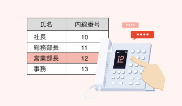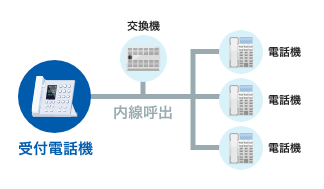 受付電話機から内線番号を入力し、特定の相手を個別に呼び出せます。ただし、来訪者が内線を呼び出す場合には、複数の操作が必要になります。