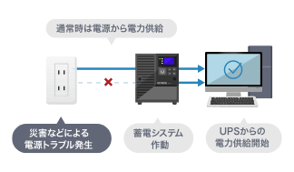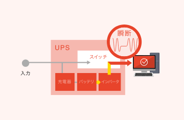 商用電源から電力を供給し、電源障害時にはバッテリーから電力を供給する方式です。この方式では、商用電源からバッテリーへの切り替え時に、一時的な電力断が発生する場合があります。