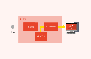 商用電源とバッテリーの両方から電力を供給する方式です。商用電源が停止しても、バッテリーから電力が供給されるので、瞬断が発生しません。ただし、大型で高価な装置のため、小規模オフィスには向きません。