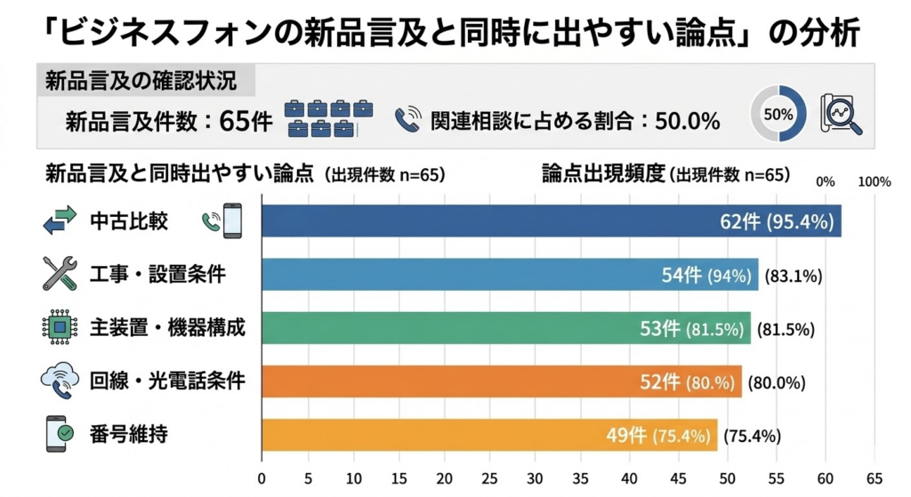 新品言及は65件、関連相談の50.0%に達していました。 そして実際には、中古比較、工事費、配線、光電話、主装置、番号維持、FAX運用といった論点が一緒に出ています。