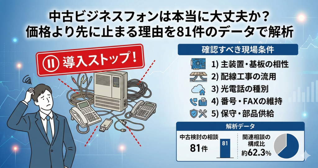 中古検討に関する相談は81件、関連相談の62.3%で確認されました。 しかも同時に語られていたのは、主装置、配線、工事、光電話、FAX、番号維持、保守、スマホ代替といった、まさに現場で導入を止める論点です。