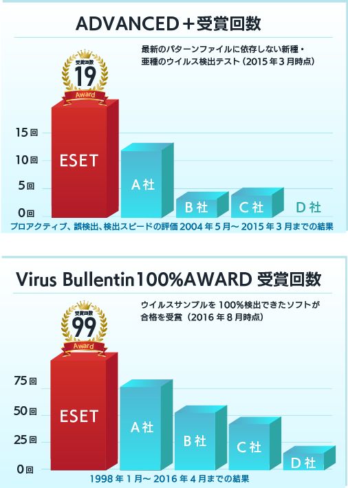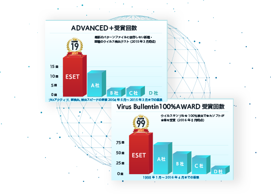 アンチウイルス業界で最も権威のある英国の研究機関Virus Bulletinによる「ウイルス検出率100%AWARD」を最多受賞しています。