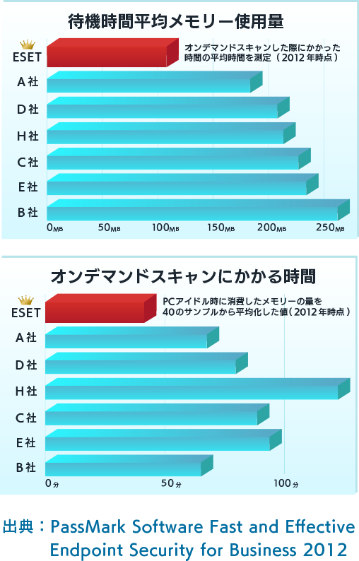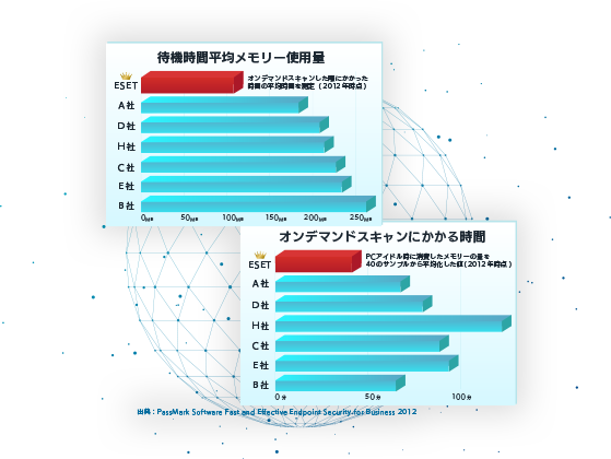 新種ウイルスを検出する独自開発のエンジンで2種類のウイルス定義データベースを利用し、クライアントPCやサーバーの負荷を軽減することで、軽快な動作を実現しました。オーストラリアの独立系ベンチマークテスト会社PassMark Softwareのさまざまなパフォーマンステストにおいても高い評価を獲得しています。
