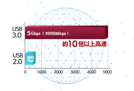 本商品が搭載しているUSB3.0の最大転送速度は5Gbps。従来のUSB2.0の最大転送速度480Mbpsに比べ約10倍以上の高速転送が可能です。