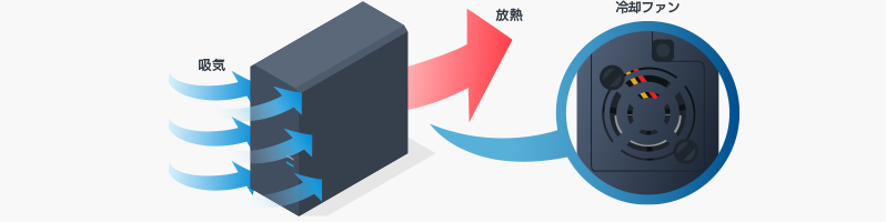 冷却ファンを標準で装着していますので、機器内部の対流が促進され、ユニット温度の低下に効果があります。温度の上昇を抑えることにより、HDDをより長持ちさせます。