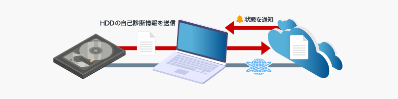 外付けハードディスクの自己診断情報をクラウドに蓄積し、お客様のハードディスクの健康状態を把握することで、ハードディスクの状態判定をお知らせするサービスです。「みまもり合図」を使用することで、故障によるデータの消失リスクを下げることができます。