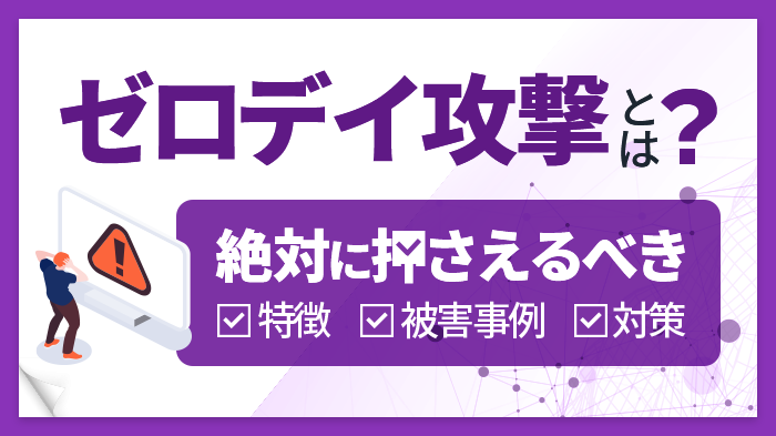 ゼロデイ攻撃とは?攻撃の特徴、被害事例、3つの対策とおすすめツールを解説 ゼロデイ攻撃という言葉を初めて聞いたのですが、どのような攻撃でしょうか? 簡単に説明すると、ゼロデイ攻撃はOSやソフトウェアの「脆弱性」が修正される前の無防備な状態に仕掛けるサイバー攻撃です。 脆弱性は「セキュリティホー...