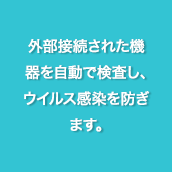 USBメモリの使用履歴を管理できます。また、USBメモリ、スマートフォン等のWPD端末の接続制限等も可能です。業務に必要のない外部媒体の接続禁止は、情報漏えいだけでなく、ウイルス感染対策にもなります。