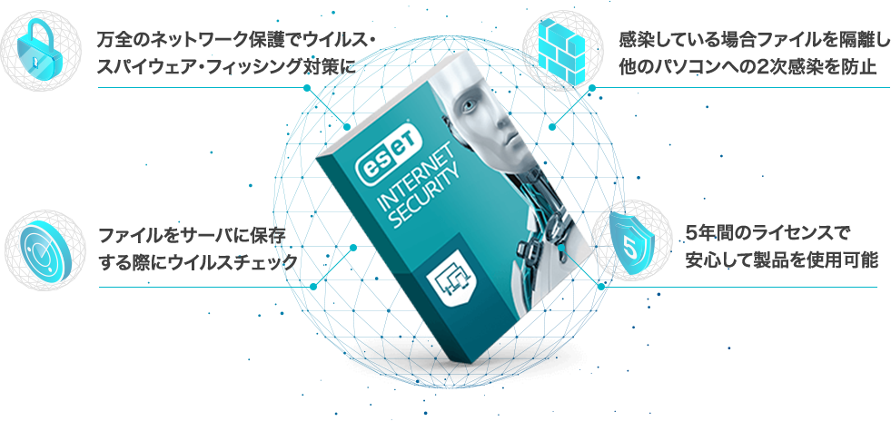 世界のさまざまな評価機関でも高い評価を受け「軽さNo.1」「満足度No.1」と認められた「ESET」を搭載しているので、サーバを使ったファイル共有において最高水準のウイルス対策が可能になります。