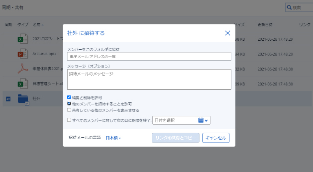 アクセス権限を取引先に付与するだけで簡単にファイルやフォルダを取引先に共有できます!