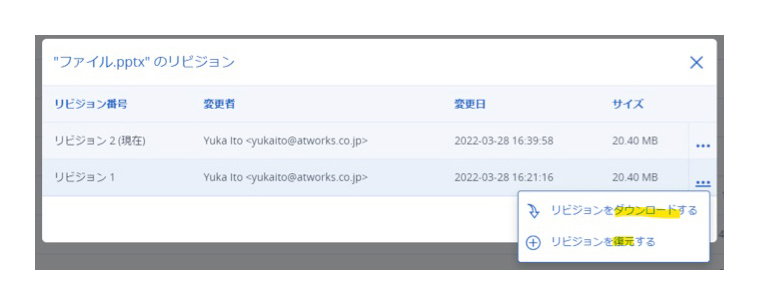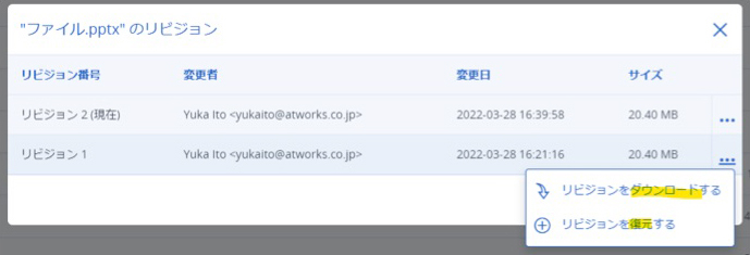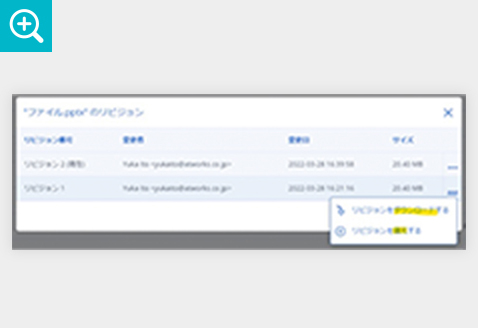 過去のファイルを復元(上書き)したり、ダウンロードができる機能が備わっており、誤って上書きされたファイルを元のバージョンに簡単に復元できます。