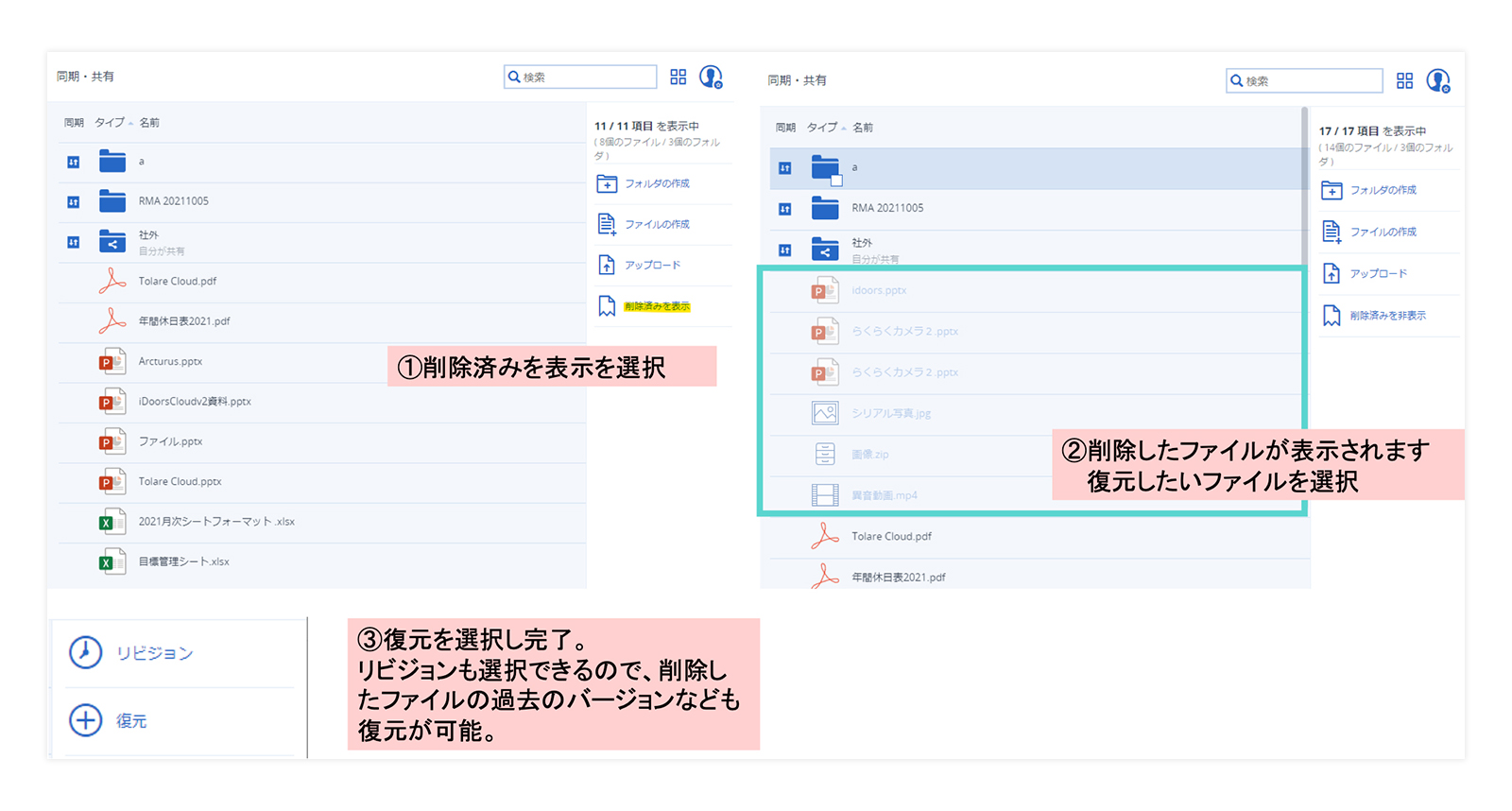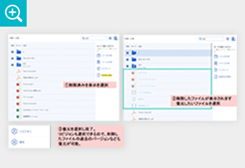 削除したデータから復元したいデータを選択するだけで、簡単に復元できます。また、削除したデータの過去のバージョンでの復元も可能です。