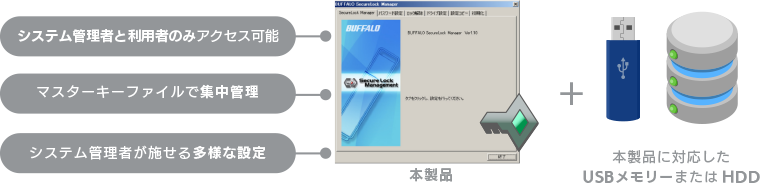 対応USBメモリを集中管理できます。システム管理者と利用者だけがアクセスできるセキュアな環境を保ちつつ、管理者は自由に対応USBメモリ内のデータにアクセスしたり、自社のセキュリティポリシーに合わせた多様な設定を行うことができます。