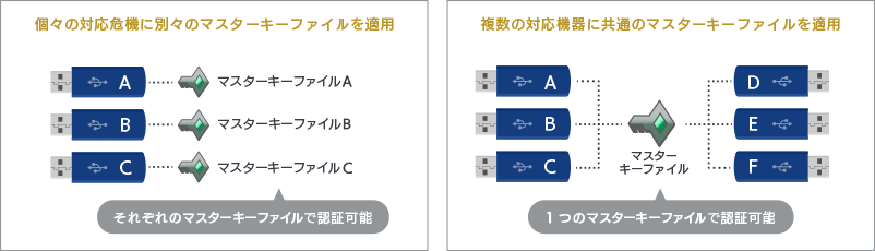 複数のUSBメモリに対して、それぞれ別のマスターキーファイルで認証が可能なため、セキュリティ面を考慮した設定を行いたい場合におすすめです。また、1つのマスターキーで複数のグループ管理も可能なので複数のUSBを一括管理したい場合などにも有効活用できます。