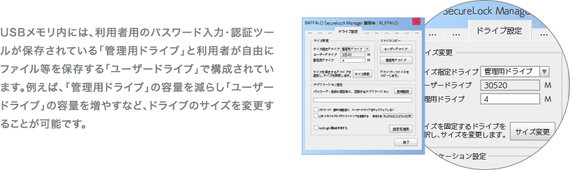 実際にご使用いただける容量(ユーザー領域)は、システム領域やソフトウェアが添付されているため表示される容量より小さくなります。本製品、およびその他のハードウェア暗号化機能搭載製品を複数同時に使用することはできません。