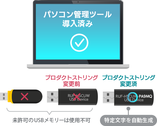 デバイス制御機能を搭載したソフトウェアを使用することで、オフィス内のPCでは接続許可されたUSBメモリー以外のデバイスを使用禁止にできます。未許可のUSBメモリは接続できないので情報漏洩を防ぐことが可能です。※ソフトウェアは別途購入となりますので、お問い合わせください。
