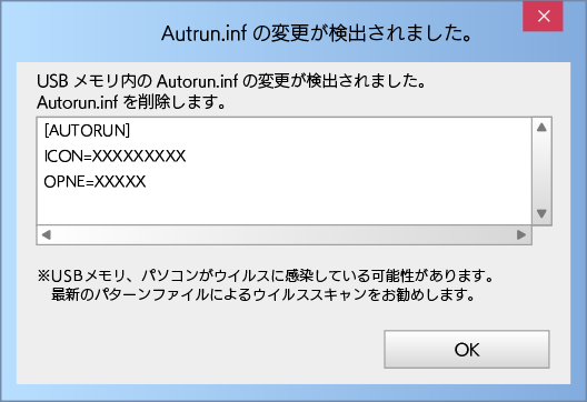 パソコンウイルスの中でも「AutoRunウイルス」と呼ばれる、USBメモリを介して感染する種類のウイルスが存在します。本商品ではAutoRunウイルスの感染拡大の仕組みに着目し、以下二段構えでウイルスの蔓延を防ぎます。