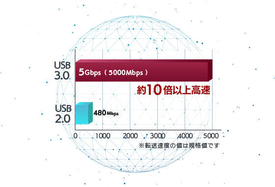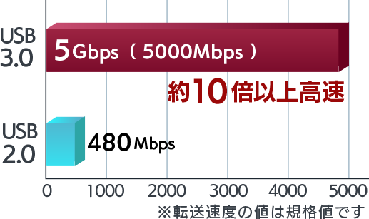 USB3.0:最大5Gbps(規格値)/ USB2.0:最大480Mbps(規格値)