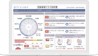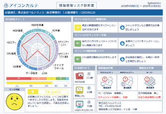 オフィス機器の利用情報を分析し、レポートにまとめて報告します。ディスクのS.M.A.R.T. 情報やセキュリティソフトの設定• 更新状況、PC の稼働時閻などから機器の健康状態を総合的に判断し、改善すぺきポイントを表示します。